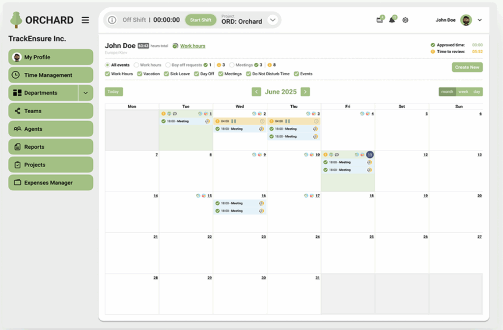 2. Track working hours, breaks, and flexible shifts with real-time clock-ins and calendar views.